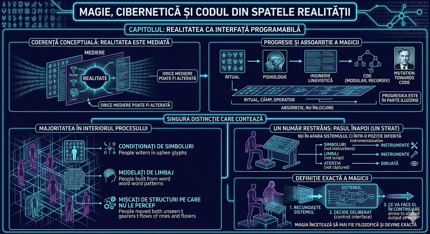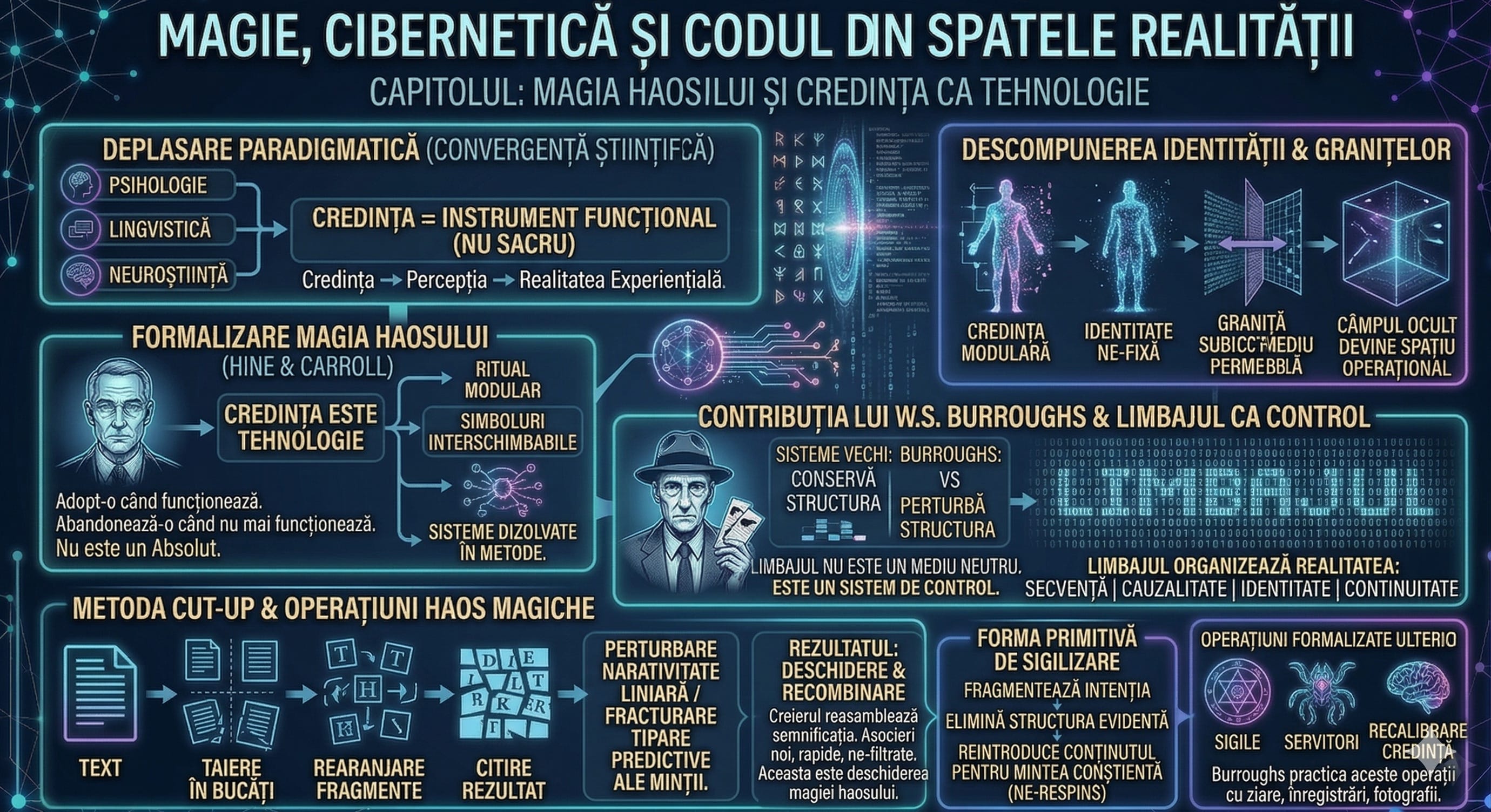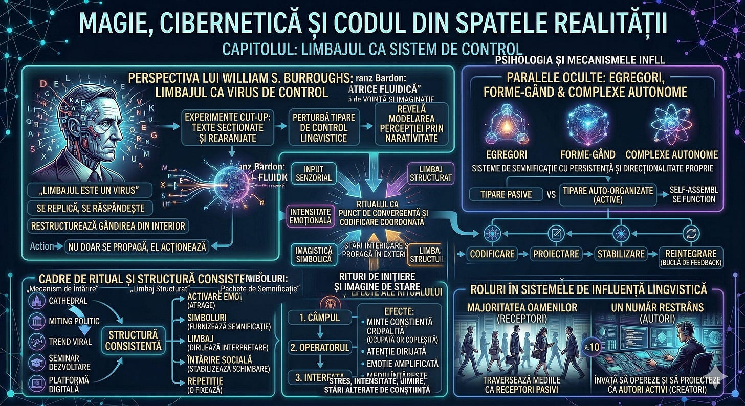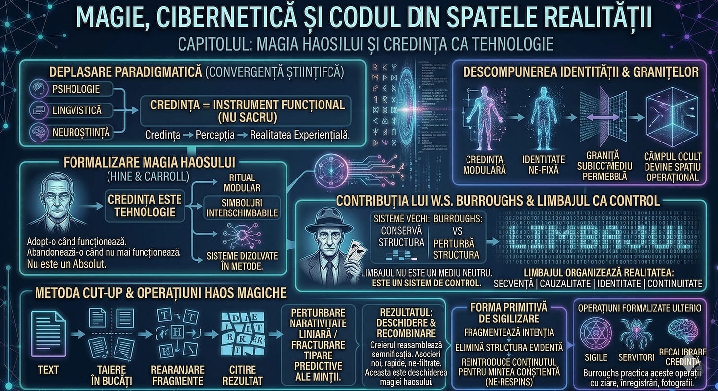 Magia debutează ca ritual. Devine psihologie. Evoluează în inginerie lingvistică. La figuri precum Burroughs, ea suferă o mutație spre ceva mai apropiat de cod: modular, recursiv, capabil să rescrie sistemul din interior.
