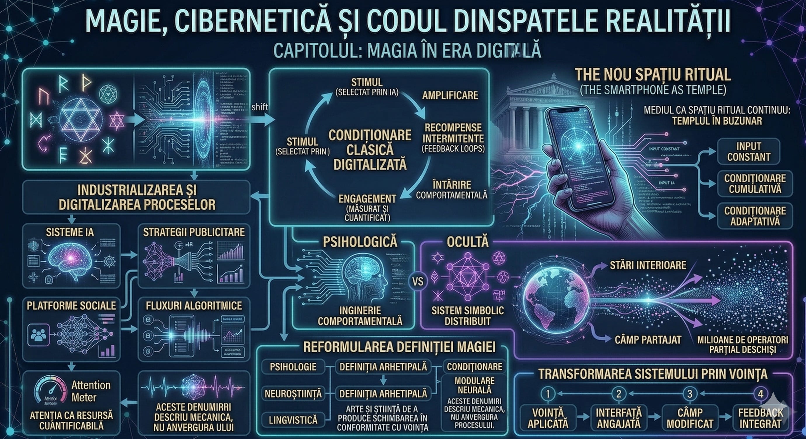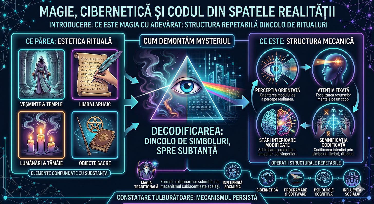 Ceea ce oamenii au numit de-a lungul istoriei „magie” apare drept misterios doar atâta vreme cât confundăm simbolurile sale cu substanța lor. Dacă îndepărtăm veșmintele, templele, limbajul arhaic, lumânările și estetica rituală, ceea ce rămâne este ceva mult mai riguros: o structură repetabilă.
