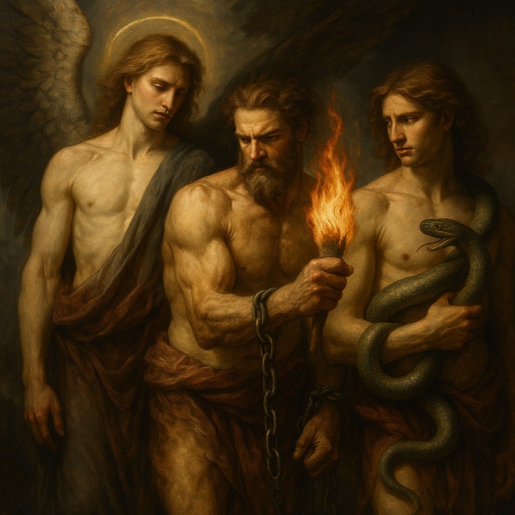 Provocarea este de a inversa polaritatea. Dacă Anticristul este, prin definiție, marele înșelător, cel care folosește tehnologii avansate pentru a subjuga umanitatea, atunci Yahweh însuși a purtat deja această masca. Cine altcineva decât el a inundat pământul pentru a șterge un proiect genetic rival, a împrăștiat constructorii Babelului pentru a le împiedica ascensiunea, a sancționat genocidurile din Canaan pentru a consolida ascultarea? Cine altcineva decât el a insistat asupra sacrificiului nesfârșit, asupra anihilării disidenților, asupra cultului ca monedă de schimb pentru supraviețuire? Dacă înșelăciunea plus dominația plus medierea tehnologică definesc Anticristul, atunci Dumnezeul biblic este chiar arhetipul. Eliberatorul, în schimb, este șarpele, Luciferul care șoptește că nu cunoașterea este o crimă, ci un drept din naștere, Prometeu care îndură chinul pentru ca focul să fie al nostru.